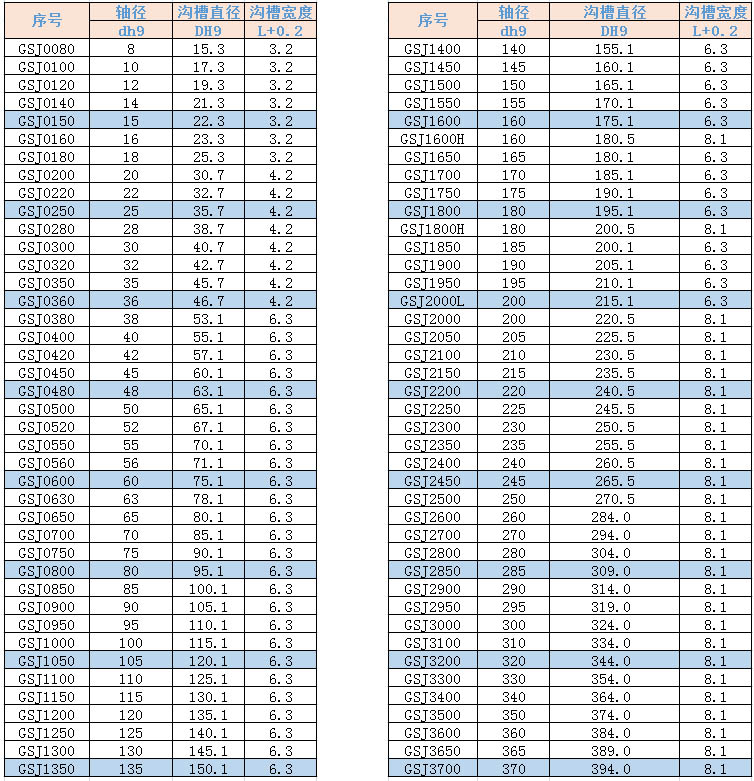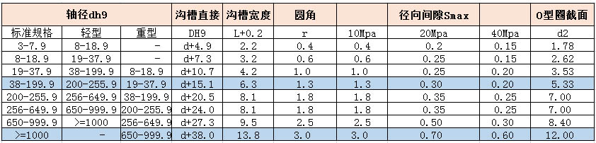 | 轴径 | 沟槽直接 | 沟槽宽度 | 圆角 | 径向间隙Smax | O型圈截面 | ||